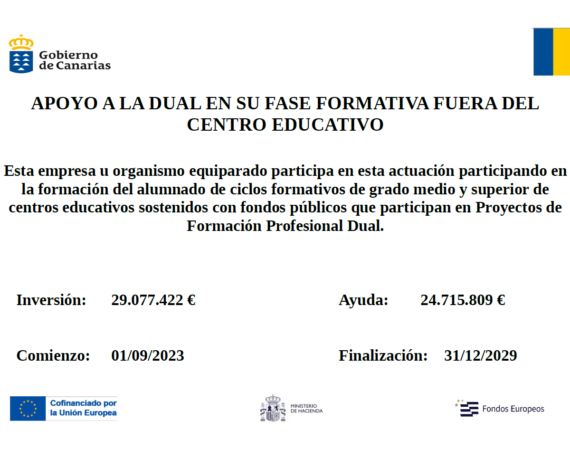 Entidad beneficiaria de las subvenciones a empresas y organismos equiparados del sector privado participante en operaciones cofinanciadas por medio del Fondo Social Europeo Plus dentro del Programa FSE+ 2021-2027 Comunidad Autónoma de Canarias pertenecientes a la actuación Apoyo a la Dual en su fase formativa fuera del centro educativo